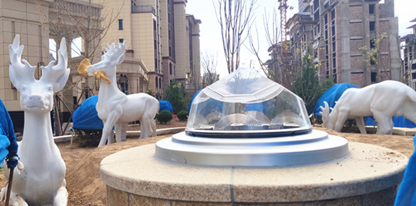 花型和圓形的蹲座與無(wú)電照明系統(tǒng)鉆石型采光器相得益彰,極具藝術(shù)氣息,瞬間就拉升整個(gè)小區(qū)的綠色景觀品位!目前為止,筆者也是第一次見(jiàn)到大理石花型的墩座,高檔小區(qū)配置就是高規(guī)格!