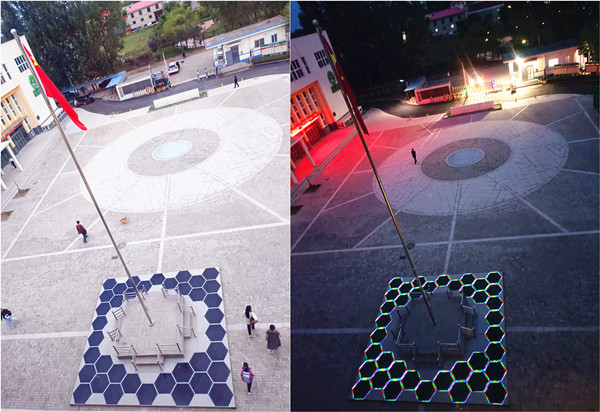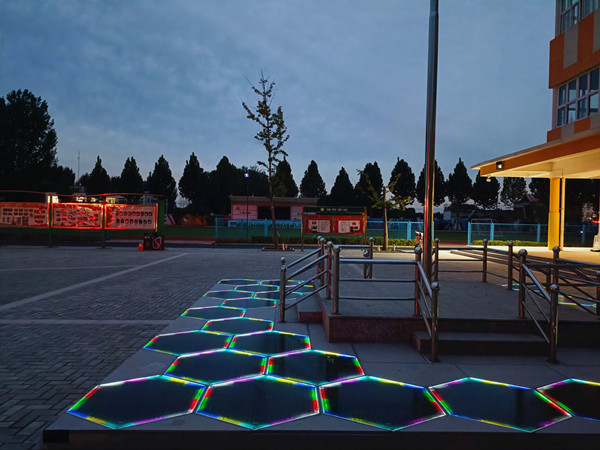 為了讓校園的廣場地面有更多實用性功能,在不影響行人的基礎(chǔ)上,采用光能寶盒發(fā)電系統(tǒng),白天直接代替地板磚進行發(fā)電,所發(fā)的電儲能留到晚上為科技樓與教學(xué)樓間的風(fēng)雨走廊提供照明用電,夜間還能發(fā)出五顏六色的景觀亮化光線,豐富校園景觀氛圍。