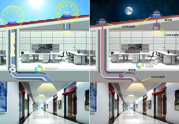 正能量科技導光管照明系統(tǒng)是通過室外采光裝置高效收集自然光,并由導光管將光反射后傳輸至漫射器,由漫射透鏡對陽光進行打散讓光線變的柔和、均勻照射到室內各個角落。晚上利用光伏發(fā)電裝置白天所發(fā)的電帶動無電照明系統(tǒng)里加裝的LED補光模塊進行照明,實現(xiàn)24小時無電照明。